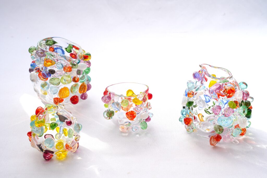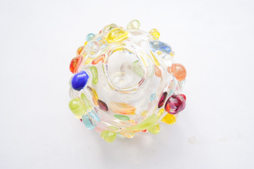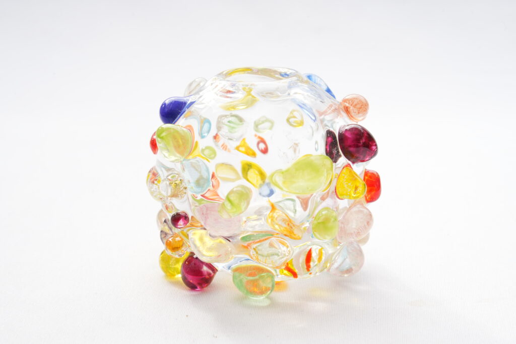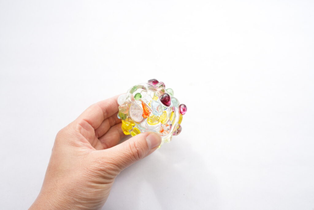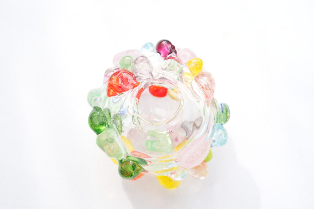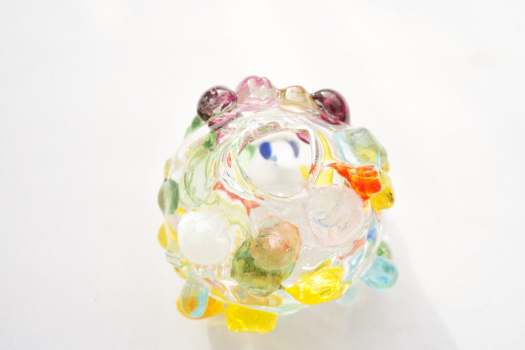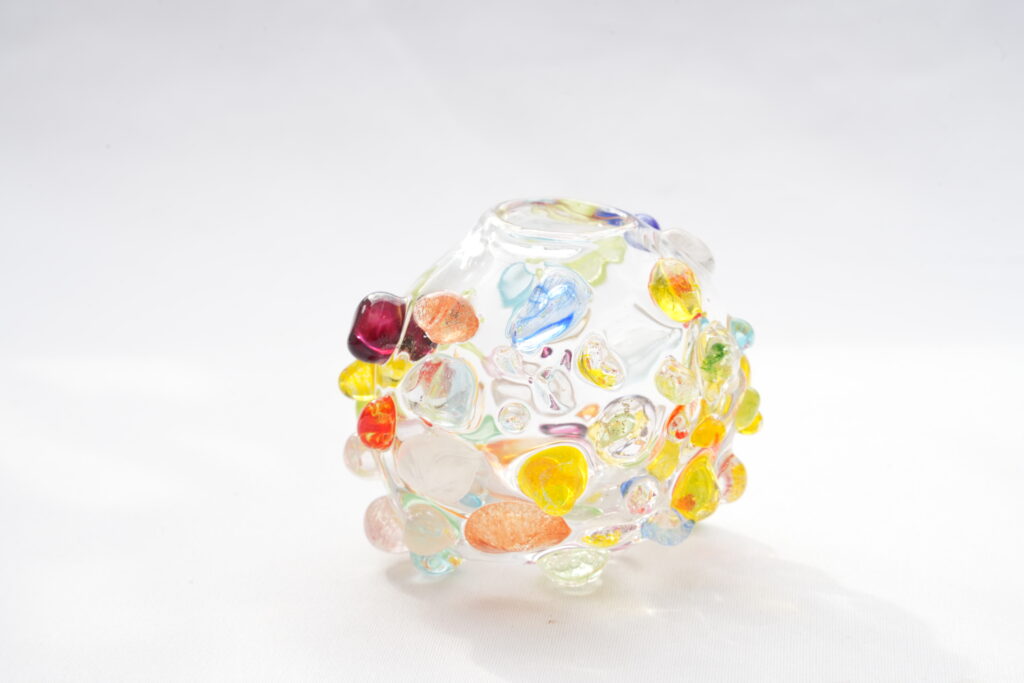 透明なガラスに、色とりどりのガラスの粒をひとつひとつ重ね、