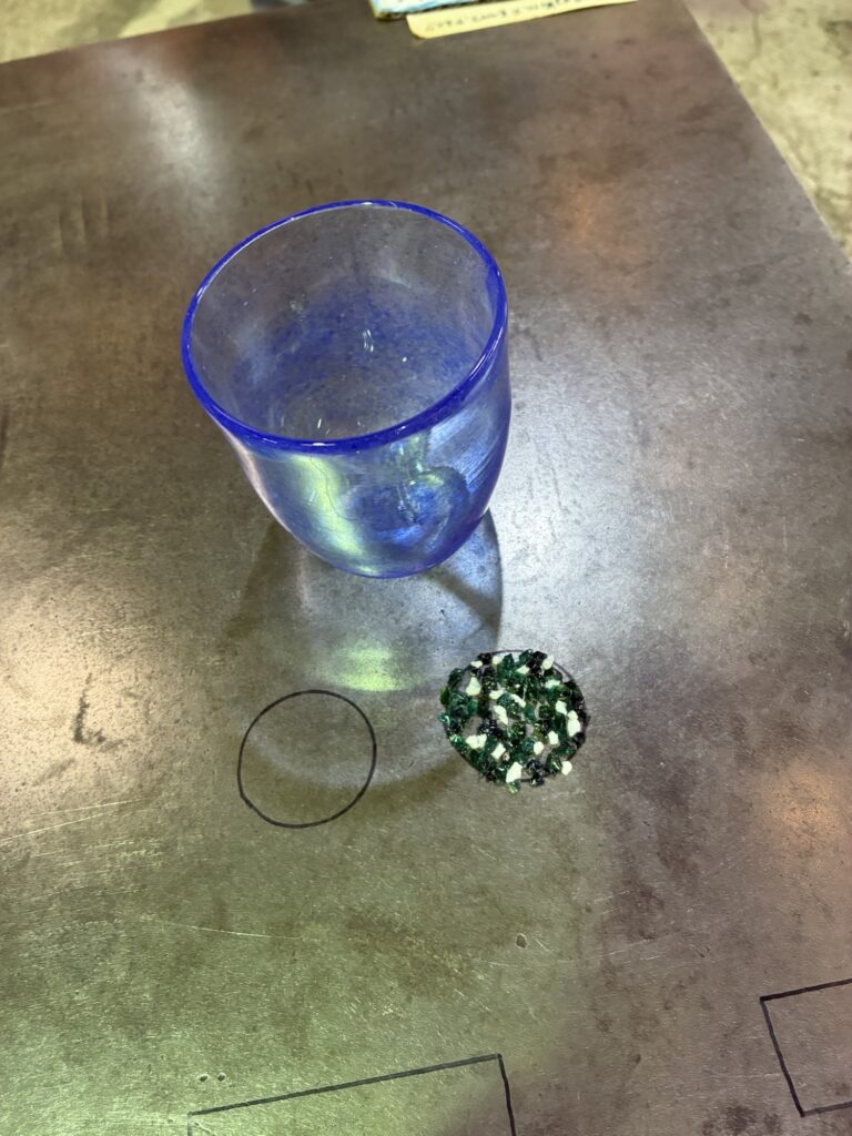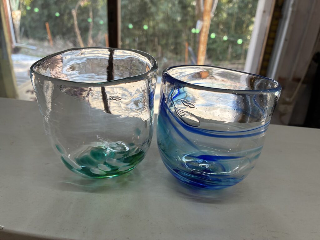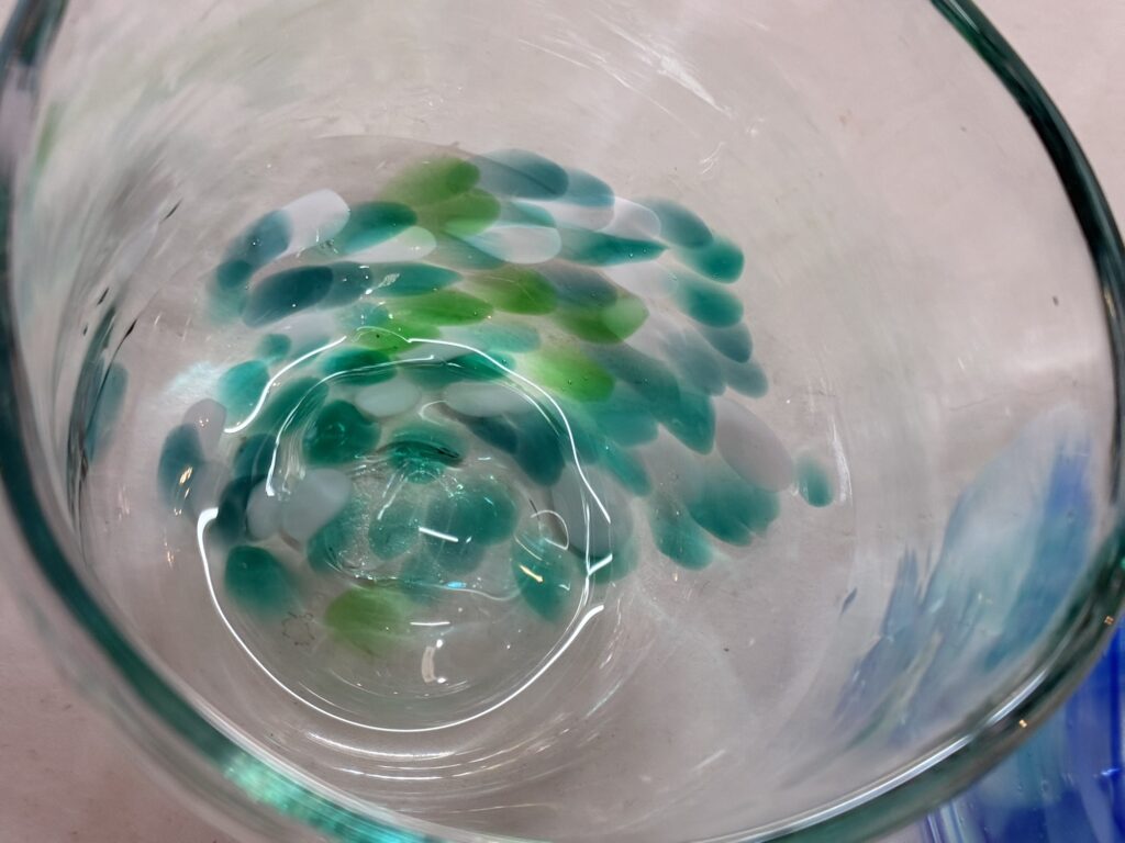 底にガラスをグイッと付けて水玉模様にするコップとぐるぐるひねったマーブル模様のコップできあがりでーす。